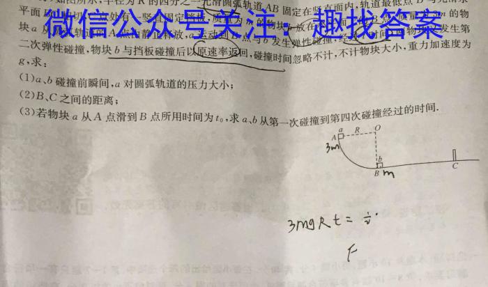 15.(18分)如图所示,半径为R的四分之一光滑圆弧轨道AB固定在竖直面内,轨道最低点B与光滑水3mBm放在水平面上的B点,质量为3m的物a两物块又发生第适t时间加二次弹性碰撞,物块b与挡板碰撞后以原速率返回,碰撞时间忽略不计,不计物块大小,重力加速度为g,求:(2)B、C之间的距离;间.(3)若a3mgRt=1&2平面BC相切,C点处有一竖直固定挡板,质量为m的物块块a从圆弧轨道的A点由静止释放,a运动到B点与b发生弹性碰撞,经过(1)a、b碰撞前瞬间,a对圆弧轨道的压力大小;(3)若物块a从A点滑到B点所用时间为t,求a、b从第一次碰撞到第四次碰撞经过的时间.t0,