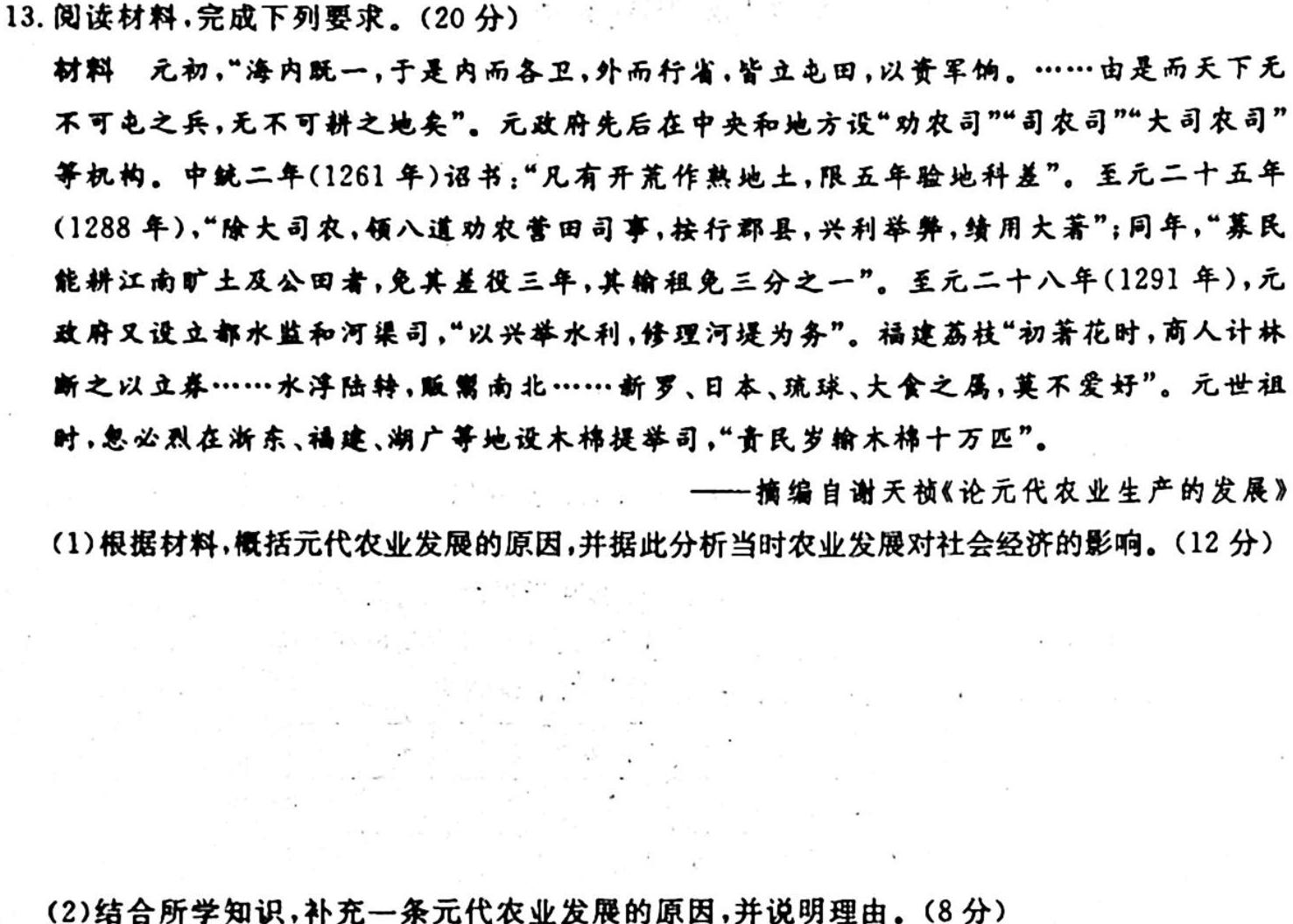 19.阅读下列材料,完成下列要求。(15分)材料一周进监管广东院试的时候,连试卷都还没有全部收齐,就把魏好古定为了秀才第20名。范进监管山东院试时,有人冒认为周进的学生,虽然其成绩很差,但范进也因周进是自己的恩师,而绚私放过了。—摘编自《偶林外史》材料二宋朝在320余年的统治中,科举取士达10万人,约为唐朝的五倍有余,录取数量与质量前所未有,宋代官员中,进士出身所占比重较唐代明显增加,逐渐形成了“文官治国”的政治格局。—摘编自马俊《科举制与唐宋士人内部结构的变化》(1)根据材料,并结合所学知识,分别阐述两则材料对研究科举制的价值。(4分)(2)根据材料并结合所学知识,简述科举制的影响。(11分)