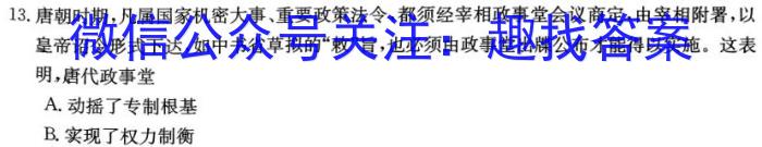 13.唐朝时期,凡属国家机密大事、重要政策法令,都须经宰相政事堂会议商定,由宰相附署,以皇帝诏令形式下达,如中书省草拟的“敕”旨,也必须由政事堂出牒公布才能得以实施。这表明,唐代政事堂A.动摇了专制根基B.实现了权力制衡