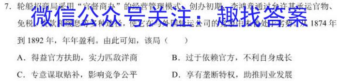 7.轮船招商局采用“官督商办”的经营管理模式。创办初期,李鸿章通过允许其承运官物、免税、贷款和缓息等多种途径,使它在与外国轮运公司的竞争中未曾处于劣势。从1874年到1892年,年年盈利。由此可知,该局()A.得益官方扶助,实力匹敌洋商B.过于依赖官方,不利自身成长C.专意谋取贴补,影响竞争公平D.享有垄断特权,助推同业发展