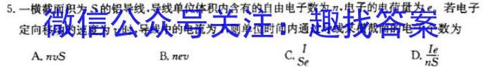 5.一横截面积为S的铝导线,导线单位体积内含有的自由电子数为n,电子的电荷量为e0,若电子定向移动的速度为v时,导线中的电流为I,则单位时间内通过导线某横截面的电子个数为A.nvSB.nev