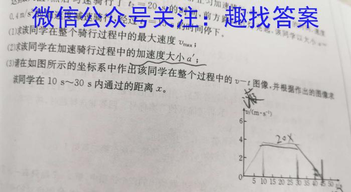 15.(17分)某同学骑着一辆自行车沿平直道路由静止匀加速骑行,经过t2=20sty0.4m/s的加速度减速骑行,经过ts=15s的时间停下。达大值,然后匀速骑行了t=20s的时间,前方路口红灯亮起,该同学以大t1=10s0.4m/s^2t3=15s起,海同大(1)求该同学在整个骑行过程中的最大速度vmaxi(2)求该同学在加速骑行过程中的加速度大小a';a';(3)请在如图所示的坐标系中作出该同学在整个过程中的v一t图像,并根据作出的图像求v-t该同学在10s∼30s内通过的距离x。s^-1)642051052202503554404550