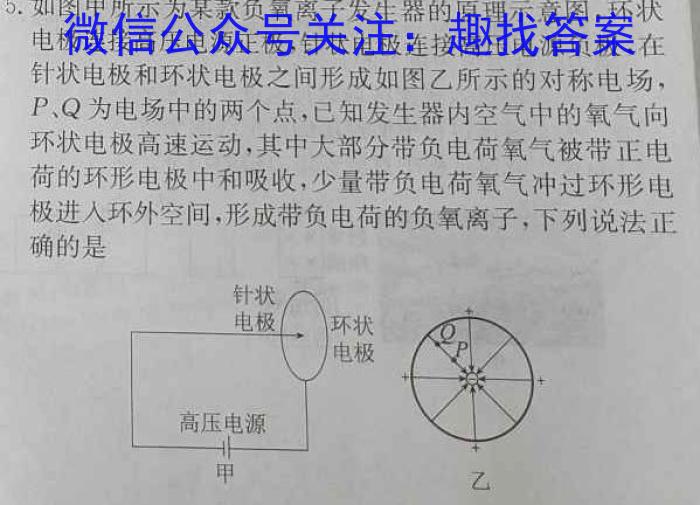 5.如图甲所示为某款负氧离子发生器的原理示意图,环状电极连接高压电源正极,针状电极连接高压电源负极,在针状电极和环状电极之间形成如图乙所示的对称电场,P、Q为电场中的两个点,已知发生器内空气中的氧气向环状电极高速运动,其中大部分带负电荷氧气被带正电荷的环形电极中和吸收,少量带负电荷氧气冲过环形电极进入环外空间,形成带负电荷的负氧离子,下列说法正确的是A.电场中B.电场中C.负氧离D.负氧离
