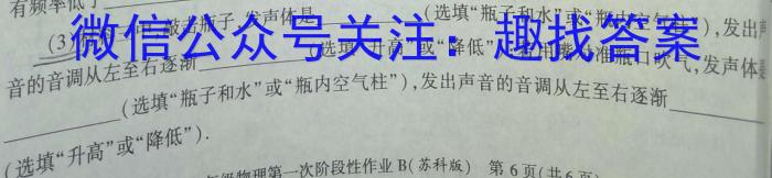 (3)材料三中,敲击瓶子,发声体是(选填“瓶子和水”或“瓶内空气柱”),发出音的音调从左至右逐渐(选填“升高”或“降低”);若用嘴对准瓶口吹气,发声体发出(选填“瓶子和水”或“瓶内空气柱”),发出声音的音调从左至右逐渐(选填“升高”或“降低”).八年级物理第一次阶段性作业B(苏科版)第6页(共6页)