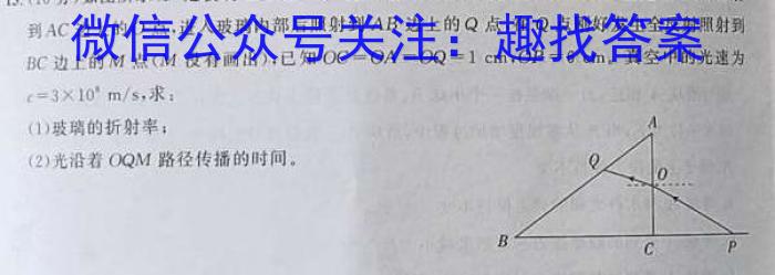 13.(10分)如图所示,P是玻璃三棱镜ABC直角边BC延长线上的点,一束单色光从P点店到AC边上的点,进人玻璃内部后照射到AB边上的Q点,在Q点刚好发生全反射照射到BC边上的M点(M没有画出),已知OC=OA=OQ=1cm,OP=6cm,真空中的光速为c=3×10mn/s,求:(1)玻璃的折射率;(2)光沿着(OQM路径传播的时间。
