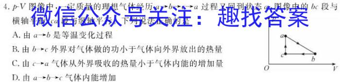 4.p-Va,图像中的bc段与图像中,一定质量的理想气体经历a→b→c→a过程又回到状态横轴平行,ca段与纵轴平行。下列说法正确的是A.由a→b是等温变化过程B.由b→c外界对气体做的功小于气体向外界放出的热量C.由c→a气体从外界吸收的热量小于气体内能的增加量D.由a→b→c气体内能增加