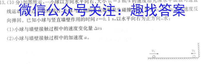 13.(10分)如图所示,一小球以方向水平向右、大小v1=3m/s的速度沿光滑水平面做匀速直线运动。经过一段时间后,小球与右侧的竖直墙壁发生碰撞,并以大小v2=2m/s的速度反向弹回。已知小球与竖直墙壁作用的时间t=0.1s,,以水平向右为正方向,求:(1)小球与墙壁接触过程中的速度变化量△v;(2)小球与墙壁接触过程中的加速度a0