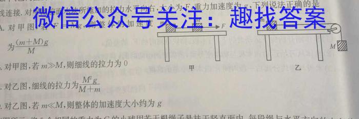 3.如甲、乙两图所示,水平光滑的桌面足够长,不计滑轮的摩擦力,质量分别为,nn、M的两个木块用轻质细线连接,对甲图前面木块所施加的拉力水平向右,大小为F,重力加速度为g,下列说法正确的是A.对甲图,若F=Mg,,则整体的加速度为(m+M)gMB.对甲图,若m>M,,则细线的拉力为0C.对乙图,细线的拉力为M^2gM+mD.对乙图,若m