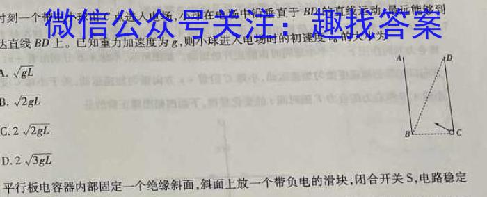 3.两块长为L的平行金属板AB、CD相距3L3一正对竖直放置,平行金属板之间为匀强电场。某时刻一个带电小球由C点进入电场,小球在电场中沿垂直于BD的直线运动,最远能够到达直线BD上。已知重力加速度为,g',则小球进入电场时的初速度v0的大小为A.gLB.2gLC.22gLD.23gLA