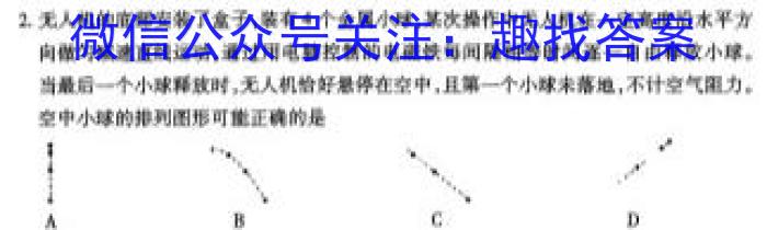 2.无人机的底部安装了盒子,装有4个金属小球,某次操作中无人机在一定高度沿水平方向做匀减速直线运动,通过用电脑控制的电磁铁每间隔相等时间逐一自由释放小球。当最后一个小球释放时,无人机恰好悬停在空中,且第一个小球未落地,不计空气阻力。空中小球的排列图形可能正确的是