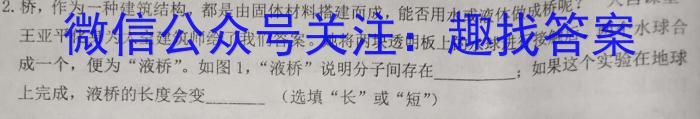 2.2.桥,作为一种建筑结构,都是由固体材料搭建而成,能否用水或液体做成桥呢?王亚平化身为太空建筑师给了我们答案。她将两块透明板上的水球进行接触后,两个水球合成一个,便为“液桥”。如图1,“液桥”说明分子间存在;如果这个实验在地球上完成,液桥的长度会变(选填“长”或“短”)