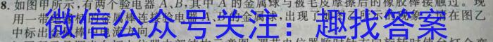 8.如图甲所示,有两个验电器A、B,其中A的金属球与被毛皮摩擦后的橡胶棒接触过,现用一带绝缘柄的金属棒连接验电器A、B的金属球,出现了如图乙所示的现象,请在图乙中标出金属棒中电流方向。