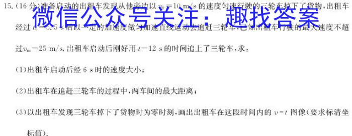 15.(16分)准备启动的出租车发现从他旁边以v0=10m/s的速度匀速行驶的三轮车掉下了货物,出租车经过t0=5.5s后以一定的加速度做匀加速直线运动去追赶三轮车,已知出租车行驶的最大速度不超过um=25m/s..出租车启动后刚好用t=12s的时间追上了三轮车,求:(1)出租车启动后经6s时的速度大小;(2)出租车在追赶三轮车的过程中,两车间的最大距离;(3)以出租车发现三轮车掉下了货物时为零时刻,画出出租车在这段时间内的v-t图像(要求标清坐标值).