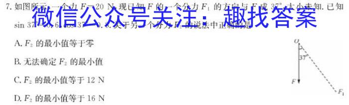 7.如图所示,一个力F=20N,,现已知F的一个分力F1的方向与F成37^,大小未知.已知37^=0.6,37^=0.8..关于另一个分力F2的说法中正确的是A.F2的最小值等于零B.无法确定F2的最小值C.F2的最小值等于12ND.F2的最小值等于16N