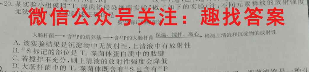 D.甲20..某实验小组模拟噬菌体侵染细菌实验"做了如下的实验(注:不同元素释放的放射强度无法区分),下列叙述正确的是是被35S标记记的噬菌体大肠杆菌一含P的培养基一含P的SP的大肠杆菌保温、拉拌、离心,检测上清液和沉淀物的放射性A.该实验结果是沉淀物中无放射性,上清液中有放射性B.^35S标记的部位是T2噬菌体蛋白质中的肽键C.若搅拌不充分,则上清液的放射性强度会降D.大肠杆菌中的T2噬菌体既含有S也含有P