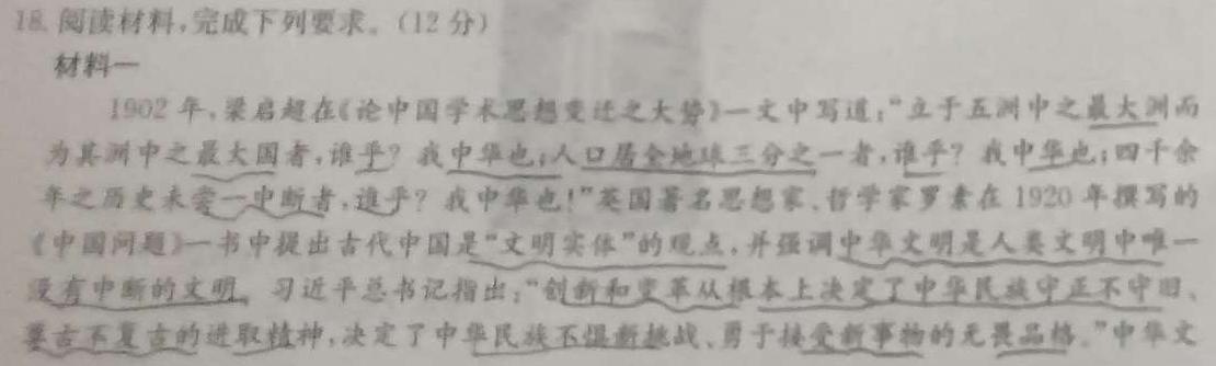 16.阅读材料,完成下列要求,(12分)材料一1902年,在(论中国学术思想迁之大》一文中写道:”立于五渊中之最大洲而为其洲中之最大国者,谁?我中华也;人旦居全地球三分之一者,谁乎?我中华也;四千余年之史来一中断者,進乎?我中华也!”英国著名思想家、哲学家罗素在15920年撰写的《中国题)一书中提出古代中国是“文明实体”的观点,并强调史华文明是人奏文暇中唯一爱有中断的文明,指出,“创新和革从本上决发工中华民放穿正不中旧、要不复的进取植神,决定了中华民族不挑战、勇于接爱新事物的无最品格。”中华文明厚选物、海百川,爱容并需,从根本上决定了中流交链融的历超向,决定描编自庾荣(深理解中华文明的五个突出特狂》材料二图4唐朝长安城左)日本平城京(右)图5建于752年的韩国国寺石塔(1根据材料一并结合所学知识,概括中华文的突出特。(4分)(2)根据材料二并结合中外历史知识,任选2幅图,以中华文化对世界的影响”为主则历史小论文,(8分)(要求:立论正确,史论结合:表述成文,叙述完整:逻辑产密,条理清晰。)
