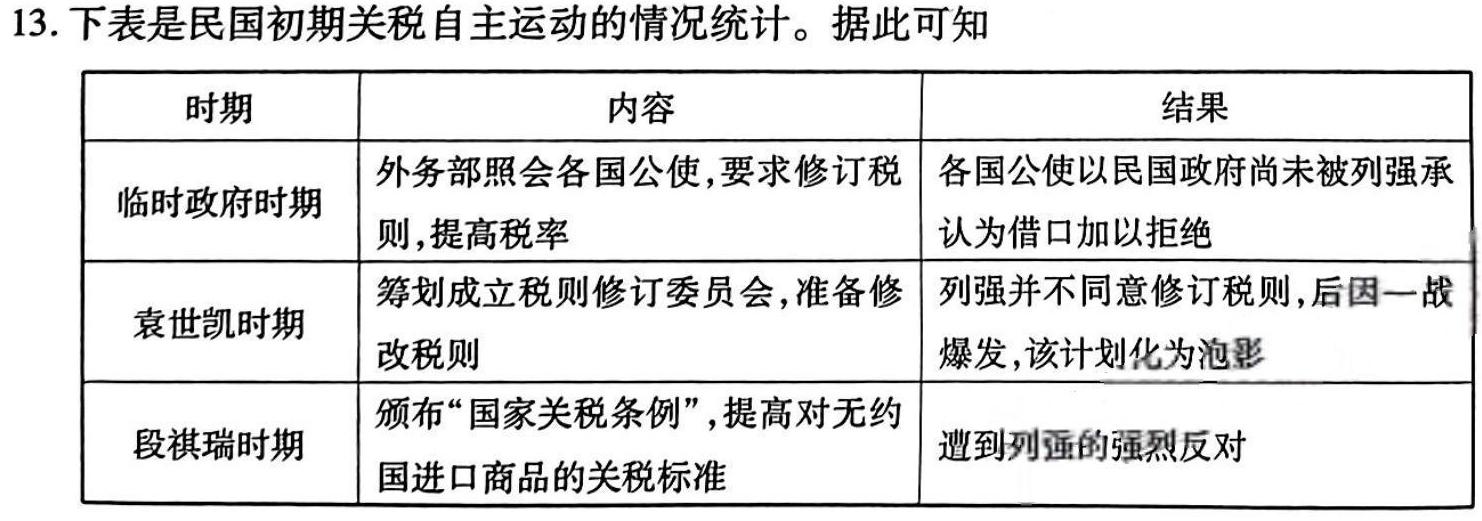 13.下表是民国初期关税自主运动的情况统计。据此可知A.中国开始逐渐丧失关税自主权B.民族独立是实现关税自主的根本前提C.民国政府积极推动关税法制化D.收回关税自主权已成为社会普遍诉求