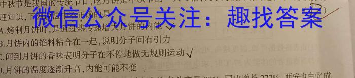 3.中秋节是我国的传统节日,吃月饼是中秋节的一大习俗,关于烤制月饼的过程中所涉及的物理知识,下列说法中不正确的是A.烤制月饼时,是通过热传递增大月饼的内能、B.月饼内的馅料粘合在一起,说明分子间有引力C.闻到月饼的香味表明分子在不停地做无规则运动、D.月饼的温度逐渐升高,内能可能不变