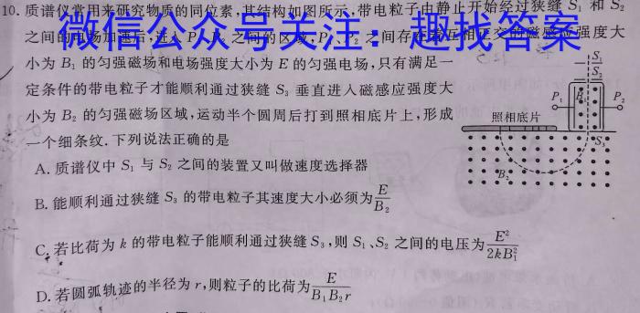 10.质谱仪常用来研究物质的同位素,其结构如图所示,带电粒子由静止开始经过狭缝S1和S2之间的电场加速后,进入P1、P2之间的区域,P1、P2之间存在着互相正交的磁感应强度大小为B1的匀强磁场和电场强度大小为E的匀强电场,只有满足一定条件的带电粒子才能顺利通过狭缝S3垂直进入磁感应强度大小为B2的匀强磁场区域,运动半个圆周后打到照相底片上,形成一个细条纹.下列说法正确的是A.质谱仪中S1与S2之间的装置又叫做速度选择器B.能顺利通过狭缝S3的带电粒子其速度大小必须为EB2.若比荷为k的带电粒子能顺利通过狭缝S,则S、S之间的电压为S3,S1、S2E^22kB1^2D.若圆弧轨迹的半径为r,则粒子的比荷为;r,EB1B2r