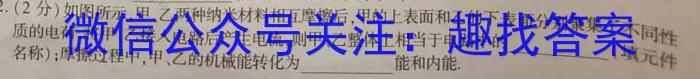 12.(2分)如图所示,甲、乙两种纳米材料相互摩擦后,甲的上表面和乙的下表面分别聚集了不同性质的电荷,将甲、乙接人电路后产生电流,则甲、乙整体上相当于电路中的(填元件名称);摩擦过程中,甲、乙的机械能转化为能和内能.