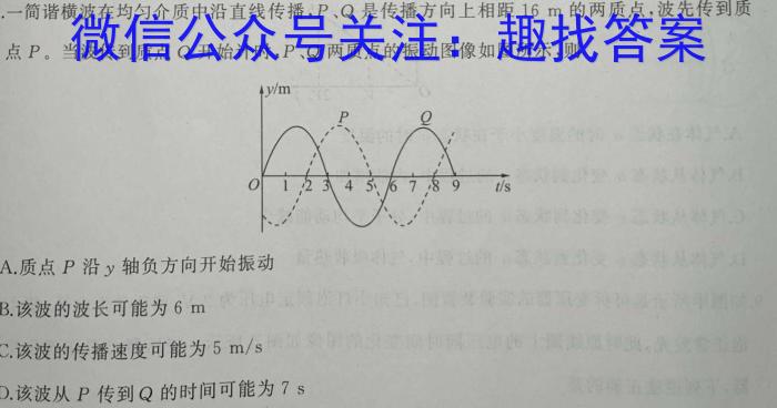 5.一简谐横波在均匀介质中沿直线传播,P、Q是传播方向上相距16m的两质点,波先传到质点P。当波传到质点Q开始计时,P、Q两质点的振动图像如图所示,则A.质点P沿y轴负方向开始振动B.该波的波长可能为6mC.该波的传播速度可能为5m/sD.该波从P传到Q的时间可能为7s