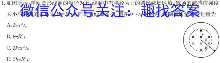 1.如图所示,单匝圆形线圈的半径为R,线圈中有半径为r的圆形磁场区域,磁场的磁感应强度大小与时间的关系为B=kt,方向垂直线圈平面.则在0t0时间内,线圈磁通量的变化量为A.kr^2t0B.kR^2t0C.2kr^2t0D.2kR^2t0