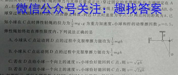 9.如图所示,一弹性轻绳(绳的弹力与其伸长量成正比)穿过固定的光滑圆环B,左端固定在A点,右端连接一个质量为m的小球,A、B、C在同一水平线上,弹性绳的自然长度等于AB.小球穿过竖直固定的杆,从C点由静止释放,到达D点时速度为零,C、D两点间的距离为h.已知小球在C点时弹性轻绳的拉力为12mg,g为重力加速度,小球和杆的动摩擦因数=0.5,弹性绳始终处在弹性限度内,下列说法正确的是A.小球从C点运动到D点的过程中克服摩擦力做功为12mghB.小球从C点运动到D点的过程中克服摩擦力做功为14mghC.若在D点给小球一个向上的速度小球恰好能回到C点,则v=ghD.若在D点给小球一个向上的速度v,小球恰好能回到C点,则v=2gh