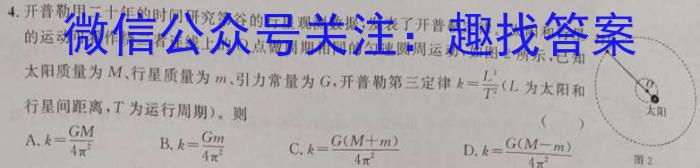 4.开普勒用二十年的时间研究第谷的行星观测数据,发表了开普勒定律,太阳和行星的运动可看作绕二者连线上的O点做周期相同的匀速圆周运动,如图2所示,已知太阳质量为M、、行星质量为m、引力常量为G,开普勒第三定律k=L^2T^2(L为太阳和行星间距离,T为运行周期),则(太A.k=GM4^2B.k=Gm4^2C.k=G(M+m)4^2D.k=G(M-m)4^2图2