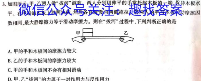 3.如图所示,甲、乙两人做“拔河”游戏。两人分别用伸平的手掌托起木板的一端,保持木板水平。在甲端的木板上放两块砖,然后各自缓慢向两侧拖拉。若两人的手与木板的动摩擦因数相同,最大静摩擦力等于滑动摩擦力。则在“拔河”过程中,下列判断正确的是A.甲的手和木板间的摩擦力较大B.乙的手和木板间的摩擦力较大C.甲的手和木板间不会有相对滑动D.甲、乙“拔河”的力属于一对作用力与反作用力
