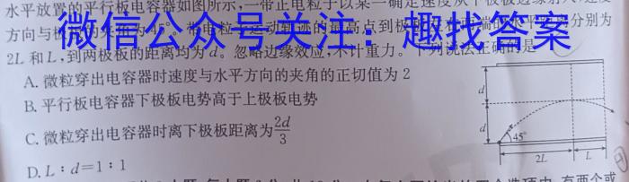 7.水平放置的平行板电容器如图所示,一带正电粒子以某一确定速度从下极板边缘射入,速度方向与极板的夹角为45^。,带电粒子运动轨迹的最高点到极板左右两端的水平距离分别为2L和L,到两极板的距离均为,忽略边缘效应,不计重力。下列说法正确的是是A.微粒穿出电容器时速度与水平方向的夹角的正切值为2B.平行板电容器下极板电势高于上极板电势C.微粒穿出电容器时离下极板距离为为2d3D.L:d=1:1