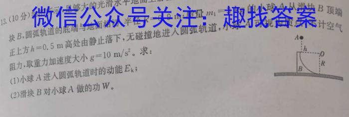 块正上方h=0.5m阻力,取重力加速度大小,g=10m/s^2。n/s²。求:(1)小球A进入圆弧轨道时的动能Ek;(2)滑块B对小球A做的功W。B,圆弧轨道的底端与地面相切,半径R=0.9m;质量道,小球A可视为可视为质点,不计空气高处由静止落下,无碰撞地进人圆弧轨