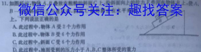 11.如图所示,物体A、B叠在粉的斜面C上滑斜面向上的拉力F作用在物体B上,A、B一起沿斜面向上匀动,斜面C终静止在水平地面上、下列说法正确的是A.此过程中,物体A受2个力作用B.程中、物体B受6个力作用C9此过程中,斜面C受6个力作用D.此过程中,地面受到的压力小于A.B,C整体所受的重力