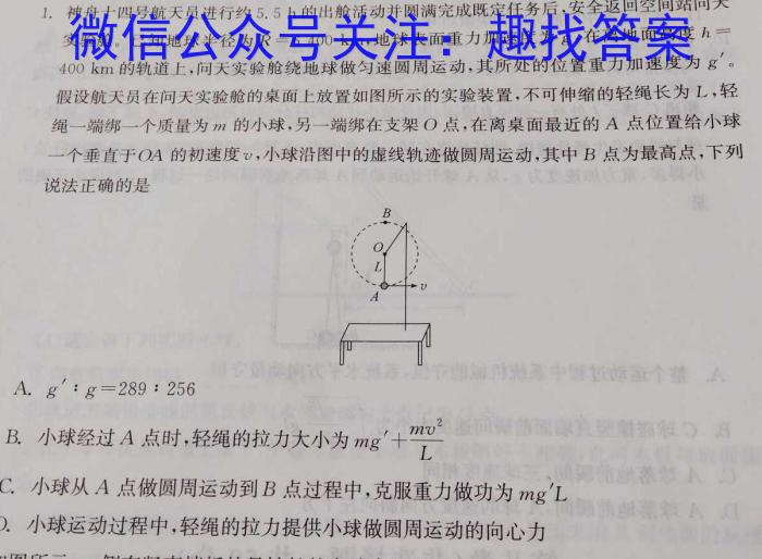 1.神舟十四号航天员进行约5.5h的出舱活动并圆满完成既定任务后,安全返回空间站问天h=实验舱。已知地球半径为R=6400km,,地球表面重力加速度为g,在离地面高度400km的轨道上,问天实验舱绕地球做匀速圆周运动,其所处的位置重力加速度为g'。假设航天员在问天实验舱的桌面上放置如图所示的实验装置,不可伸缩的轻绳长为L,轻绳一端绑一个质量为m的小球,另一端绑在支架点,在离桌面最近的A点位置给小球一个垂直于OA的初速度v,小球沿图中的虚线轨迹做圆周运动,其中B点为最高点,下列说法正确的是A.g':g=289:256B.小球经过A点时,轻绳的拉力大小为mg^+mv^2LC.小球从A点做圆周运动到B点过程中,克服重力做功为mg'LD.小球运动过程中,轻绳的拉力提供小球做圆周运动的向心力