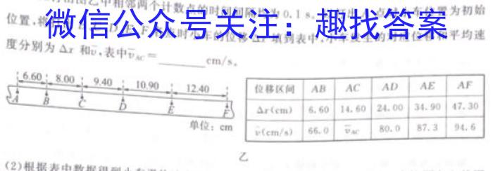 (1)已知打出图乙中相邻两个计数点的时间间隔均为0.1s,以打出A点时小车位置为初始位置位置,将打出B、C、D,E、F各点时小车的位移Ax填到表中,小车发生的对应位移和平均速△x度分别为△x和v,表中vAC=cm/s.乙