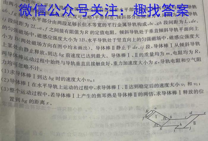 (1分)如(16分)如图所示,平行光滑的金属导轨由倾斜部分和水平部分组成,倾斜导轨与水平导轨由两小段光轨与水平导轨ab、fgL的由两小段光滑绝缘圆弧轨道(长度可忽略)平滑相连,倾斜部分由倾角为、间距为L的导轨的导轨θ、为ab、fg构成,水平部分由两段足够长但不等宽的平行金属导轨构成,be、gh段间距为L,de、j段间距为i段间距为2L,a、f之间接有阻值为R的定值电阻。倾斜导轨处于垂直倾斜导轨平面向上的匀强2L,a、f顶斜导轨平面向上强磁阻值为R的应强强度大的匀匀强磁场中,磁感应强度大小为3,水平导轨处于竖直向上的匀强磁场中,磁感应强度大小为B导小为B(两处磁场方向在图中均未画出)。导体棒Ⅱ静止于de、i段,导体棒I从倾斜导轨上某处由m电阻均为RR,上某处由静止释放,到达bg前速度已达到最大。导体棒I、Ⅱ的质量均为m、电阻均为R,两且和空气两导体棒运动过程中始终与导轨垂直且接触良好,重力加速度大小为g,导轨电阻和空气阻力均可忽略不计。(1)求导体棒I到达bg时的速度大小vm;vm;v1v2;(2)导(2)导体棒I在水平导轨上运动的过程中,求导体棒I、Ⅱ达到稳定后的速度大小v和v2;(3)整个运动过程中,若导体棒I上产生的焦耳热是导体棒Ⅱ的两倍,求导体棒I释放的位bg置到bg的距离x。aRbbhⅡgi