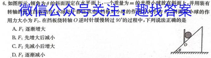 6.如图所示,倾角为θ的斜面固定在水平面上,一个质量为m的光滑小球放在斜面上,并用装有转轴的竖直挡板挡住,小球处于静止状态,挡板对小球的作用力大小为F1,,斜面对小球的作用力大小为F2..在挡板绕转轴O逆时针缓慢转过90^的过程中,下列说法正确的是A.F1逐渐增大B.F1先增大后减小C.F2先减小后增大D.F2逐渐减小