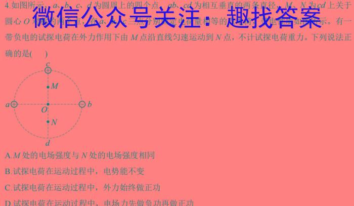 4.如图所示,a、b、c、d为圆周上的四个点,ab、cd为相互垂直的两条直径,M、N为cd上关于圆心对称的两个点,在a、b、c三点分别固定电荷量相等的点电荷,带电性质如图所示。有一带负电的试探电荷在外力作用下由M点沿直线匀速运动到N点,不计试探电荷重力。下列说法正确的是()A.M处的电场强度与N处的电场强度相同B.试探电荷在运动过程中,电势能不变C.试探电荷在运动过程中,外力始终做正功D.试探电荷在运动过程中,电场力先做负功再做正功