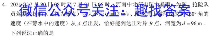 4.2021年7月20日08时至7月21日06时,河南中北部出现大暴雨。如图,抢险队员驾驶救援船(可视为质点)以大小为v1=12m/s、船头与上游河岸成=60^角的速度(在静水中的速度)从A点出发,恰好能到达正对岸B点,河宽为d=96m。下列说法正确的是