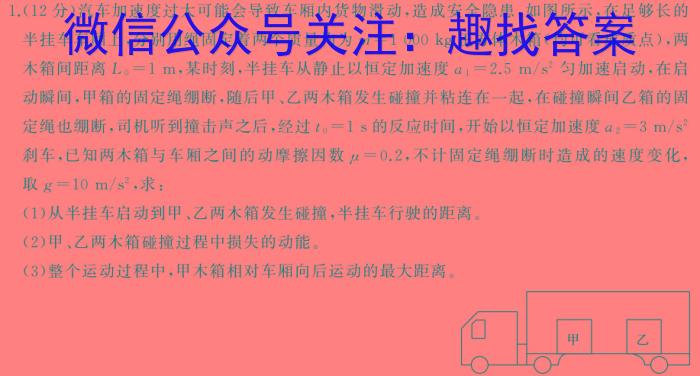 1.(12分)汽车加速度过大可能会导致车厢内货物滑动,造成安全隐患,如图所示,在足够长的半挂车车厢上,分别用绳固定着两个质量均为m=1000kg正方体木箱(均可看成质点),两木箱间距离L0=1m,,某时刻,半挂车从静止以恒定加速度a1=2.5m/s^2匀加速启动,在启动瞬间,甲箱的固定绳绷断,随后甲、乙两木箱发生碰撞并粘连在一起,在碰撞瞬间乙箱的固定绳也绷断,司机听到撞击声之后,经过t0=1s的反应时间,开始以恒定加速度a2=3m/s^2刹车,已知两木箱与车厢之间的动摩擦因数=0.2,不计固定绳绷断时造成的速度变化,取g=10m/s^2,,求:(1)从半挂车启动到甲、乙两木箱发生碰撞,半挂车行驶的距离。(2)甲、乙两木箱碰撞过程中损失的动能。(3)整个运动过程中,甲木箱相对车厢向后运动的最大距离。