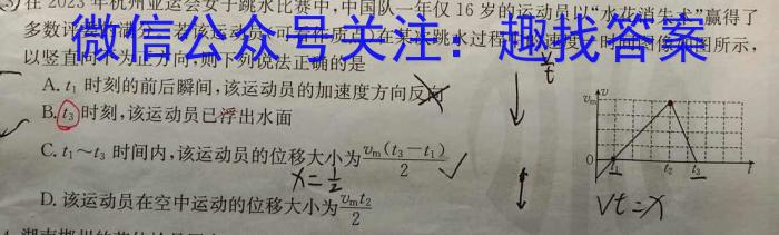 3在2023年杭州亚运会女子跳水比赛中,中国队一年仅16岁的运动员以“水花消失术”赢得了多数评委的满分。若该运动员(可看作质点)在某次跳水过程中的速度一时间图像如图所示,以竖直向下为正方向,则下列说法正确的是CA.t1时刻的前后瞬间,该运动员的加速度方向反B.t3)时刻,该运动员已浮出水面C.t1t3时间内,该运动员的位移大小为um(t3-t1)2x=1&2D.该运动员在空中运动的位移大小为y=vmt22