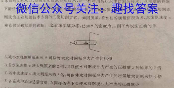 4水切又称水刀,即高压水射流切割技术,是一种利用高压水流切割的技术。在电脑的控制下能任意雕琢工件,而且受材料质地影响小。因为其成本低,易操作,良品率又高,水切割逐渐成为工业切割技术方面的主流切割方式。如图所示,若水柱的横截面积为S,水流以速度垂直射到被切割的钢板上,之后速度减为零,已知水的密度为ρ,,则下列说法正确的是A.减小水柱的横截面积S可以增大水对钢板冲力产生的压强B.若水流速度增大到原来的2倍,可以使水对钢板冲力产生的压强增大到原来的2倍C.若水流速度增大到原来的2倍,可以使水对钢板冲力产生的压强增大到原来的4倍D.若在水中添加适量食盐,在同样条件下会使水对钢板冲力产生的压强减小
