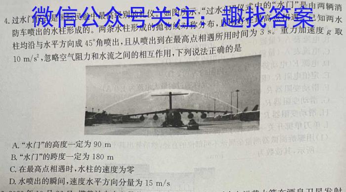 防车喷出的水柱形成的。两条水柱形成的抛物线对称分布,且刚好在最高点相遇。已知两水8柱均沿与水平方向成45°角喷出,且从喷出到在最高点相遇所用时间为3s。重力加速度g取45^10m/s²,忽略空气阻力和水流之间的相互作用,下列说法正确的是10m/s^2,A.“水门”的高度一定为90mB.“水门”的跨度一定为180mC.在最高点相遇时,水柱的速度为零D.水喷出的瞬间,速度水平方向分量为15m/s