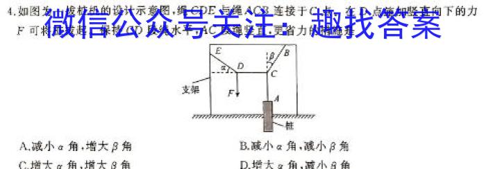 4.如图为一拔桩机的设计示意图,绳CDE与绳ACB连接于C点,在D点施加竖直向下的力F可将桩拔起。保持CD段绳水平,AC段绳竖直,更省力的措施是A.减小a角,增大角B.减小角,减小β角C.增大角,增大β角D.增大a角,减小角
