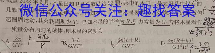 4.截至2023年2月,木星已知卫星总数已达92颗,其中的木卫二是太阳系中仅有有的几颗可能孕育生命的星球之一。已知木卫二在离木星表面高h处绕木星近似做匀速圆周运动,其公转周期为T.已知木星的半径为R,引力常量为G,若将木星看作一质量分布均匀的球体,则木星的密度为4&xrA.3GT^2=1&2B.3hGRT^2C.3(h+R)GRT^2D.3(R+1GT^2R9=30&4