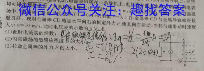 13.(10分)如图所示,金属棒CD垂直放在位于水平面的两条固定平行光滑金属导轨上,导轨左端接有有R=2.5J的电阻,电流表串联在一条导轨上,电压表并联在电阻R两端,两电表均可视为理想电表。两条导轨电阻不计,间距L=0.4m,处在垂直导轨平面向下的匀强磁场中。金属棒CD的长度也等于L=0.4m、、阻值r=0.5Ω,,金属棒CD与金属导轨始终接触良好。现对金属棒ClD施加水平向右的恒定外力F使其向右运动,当其匀速滑动时速度大小v=10m/s,(1)此时电流表的示数;(2)匀强磁场的磁感应强度B的大小(3)拉动金属棒的外力F的大小。