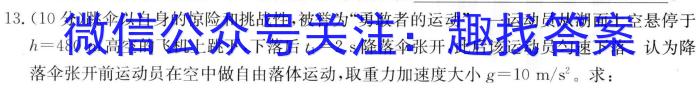 13.(10分)跳伞以自身的惊险和挑战性,被誉为“勇敢者的运动”。一运动员从湖面上空悬停于h=480m高空的飞机上跳下,下落后t1=2s降落伞张开,此后该运动员匀速下落。认为降落伞张开前运动员在空中做自由落体运动,取重力加速度大小g=10m/s^2。,求:(1)该运动员落到湖面上时的速度大小v;(2)该运动员落到湖面上所用的时间t0