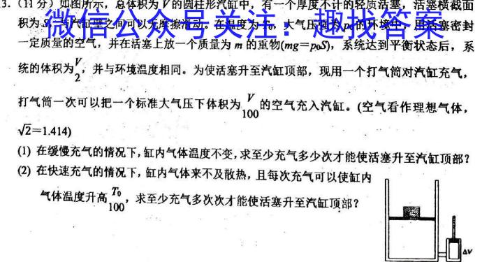13.(11分)如图所示,总体积为V的圆柱形汽缸中,有一个厚度不计的轻质活塞,活塞横截面S3与汽缸壁之间可以无摩擦滑动。在温度为T0,,大气压强为的环境中,用活塞密封一定质量的空气,并在活塞上放一个质量为m的重物(mg=p0S),,系统达到平衡状态后,系统的体积为并与环境温度相同。为使活塞升至汽缸顶部,现用一个打气筒对汽缸充气,打气筒一次可以把一个标准大气压下体积为10的空气充入汽缸。(空气看作理想气体,2=1.414)(1)在缓慢充气的情况下,缸内气体温度不变,求至少充气多少次才能使活塞升至汽缸顶部?(2)在快速充气的情况下,缸内气体来不及散热,且每次充气可以使缸内气体温度升高100^T0,求至少充气多次次才能使活塞升至汽缸顶部
