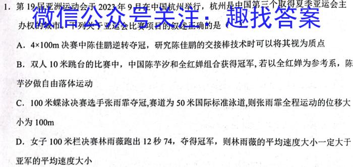 1.第19届亚洲运动会于2023年9月在中国杭州举行,杭州是中国第三个取得夏季亚运会主办权的城市。下列关于亚运会比赛项目的叙述正确的是()A.4×100m决赛中陈佳鹏逆转夺冠,研究陈佳鹏的交接棒技术时可以将其视为质点B.双人10米跳台的比赛中,中国陈芋汐和全红婵组合获得冠军,若以全红婵为参考系,陈芋汐做自由落体运动C.100米蝶泳决赛选手张雨霏夺冠,赛道为50米国际标准泳道,则张雨霏全程运动的位移大小为100mD.女子100米栏决赛林雨薇跑出12秒74,夺得冠军,则林雨薇的平均速度大小一定大于亚军的平均速度大小
