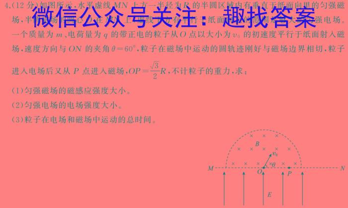 4.(12分)如图所示,水平虚线MN上方一半径为R的半圆区域内有垂直于纸面向里的匀强磁场,半圆磁场的圆心O在MN上,虚线下方有平行于纸面向上的范围足够大的匀强电场。一个质量为m、电荷量为q的带正电的粒子从O点以大小为v0的初速度平行于纸面射入磁场,速度方向与ON的夹角=60^,,粒子在磁场中运动的圆轨迹刚好与磁场边界相切,粒子进入电场后又从P点进入磁场,OP=32R,不计粒子的重力,求:(1)匀强磁场的磁感应强度大小。(2)匀强电场的电场强度大小。(3)粒子在电场和磁场中运动的总时间。