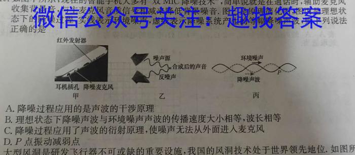 19.如图甲所示,现在的智能手机大多有“双MIC降噪技术”,简单说就是在通话时,辅助麦克风收集背景音,与主麦克风音质信号相减来降低背景噪音.图乙是原理简化图,图丙是理想状态下的降噪过程,实线表示环境噪声,虚线表示降噪系统产生的等幅降噪声波,则下列说法正确的是A.降噪过程应用的是声波的干涉原理B.理想状态下降噪声波与环境噪声声波的传播速度大小相等,波长相等C.降噪过程应用了声波的衍射原理,使噪声无法从外面进入麦克风D.P点振动减弱点
